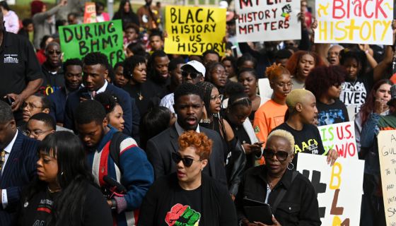 Demonstrators protest Florida Governor Ron DeSantis plan to eliminate Advanced Placement courses on African American studies in high schools as they stand outside the Florida State Capitol on February 15, 2023, in Tallahassee, Florida. | Source: The Washington Post / Getty